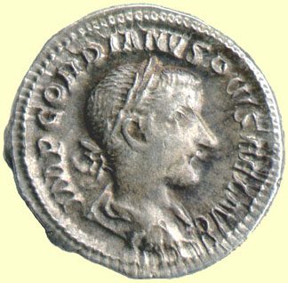 Denarius With Portrait of the Boy Emperor Gordianus III Reigning from A. D. 238 to 344, Gordian had a longer reign than most of the emperors in the mid Third Century. Like many others, though, he was highly popular when first elevated to the throne but was Eventually murdered by his Praetorian Prefect, Philip the Arab. |