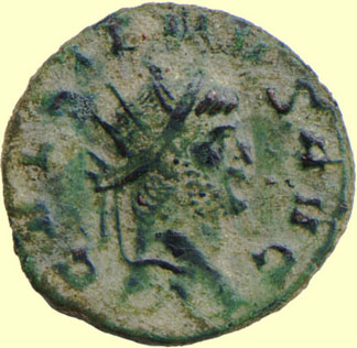 Antoninianus of Gallienus with Centaur Reverse This portrait of Gallienus is still quite decent despite the heavy green patination on this coin. Pieces like this abound at coin shows and are a bargain at four to eight dollars each from dealers' "junk boxes". By spending time reading books, browsing on - line, and studying the actual coins at shows, neophyte collectors will be able before long to recognize this as a portrait of Gallienus regardless of the legibility of the inscription. |