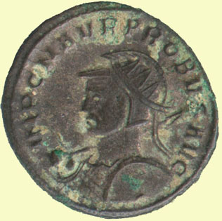 Radiate of Probus with Emperor Wearing Crested Helmet In this portrait, the emperor Probus appears in full battle armour, although the artist has left the cheekpieces off in order to more fully show his face. He carries a spear over his right shoulder and a shield protects his left. Through the wear, traces of detail also remain on his cuirass. |