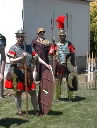 Gaius Germanicus Magnus (Steve Oster), Patti Ballard, and Antony Lucius (Anthony Garbisch) stand with pilum and shield ready.