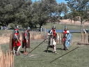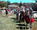 Centurio Marcus (Robert Garbisch) leads the line in the gladius attack while Lady Lydia (Linda Gaarbisch) looks on. Also shown a