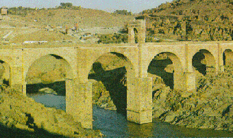 To create a voussoir arch, one half of this ring of stones was simply stood up on its ends. These ends rested on piers made of stone blocks mortared together with pozzolana cement in the typical Roman arch bridge. The weight of the stone and concrete of the bridge itself compressed the tapered stones together, making the arch an extremely strong structure. Heavy wagons and legions of troops could safely cross a bridge constructed of arches without collapsing the structure. Many of these bridges lasted long after the Roman Empire in the West had fallen and survived the period of barbarian destruction of the Fifth through Ninth Centuries. Several of the original stout Roman arch bridges lasted through the midle ages and on into modern times, even serving General George Patton in the fighting during World War II just as they had served Caesar and Trajan almost two millennia before.