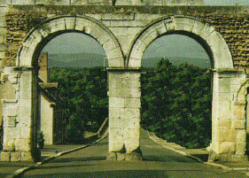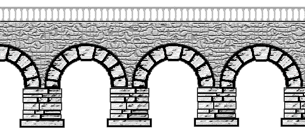 The typical finished bridge designed for pedestrian and wheeled traffic looked much like the one in the drawing below, except that the artist has left heavy black lines showing how the stones were fitted together. The spaces between the arches were filled with smaller stones held together with pozzolana concrete. The whole structure was faced with flat stone mortared together which was sometimes reinforced with iron clamps. A concrete railing along the top kept people and animals from falling off the edge of the roadway while adding a final decorative touch to the bridge. The bases of the arches rested on stone masonry piers, which were often built on top of a boat shaped cutwater designed to allow a fast moving current to flow around the bridge supports with less erosion from swirling water and sand.