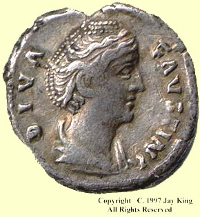 The author's first Roman coin was a worn denarius of DIVA FAVSTINA. This was a commemorative coin issued after her death. Though it is quite worn, the elaborate hair style, piled high on her head with the hair interwoven with strings of pearls is still evident. The coin displayed with this article is in far better condition and much more of the hair detail can be seen. Most coins of Faustina the Elder can be identified by this distinctive feature not found on the coins of any other empress.