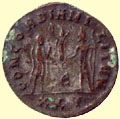 Obverse Inscription: IMP CC VAL DIOCLETIANVS AVG Reverse Inscription: CONCORDIA MILITVM, no mintmark in exergue Diocletian standing right receiving victory on globe from Jupiter stg left, kr between Catalog Numbers: Sear S3540 Grade: AF, nice reddish brown patina with gray highlights