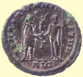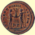 Obverse Inscription: IMP C DIOCLETIANVS AVG Reverse Inscription: CONCORDIA MILITVM, ALE in exergue Diocletian standing right receiving victory on globe from Jupiter stg left, r between Catalog Numbers: Sear S3540