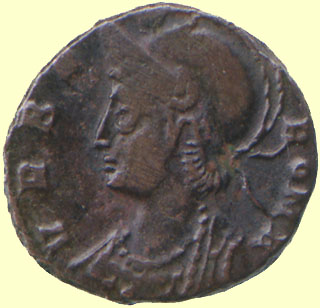 This AE 4 matches the obverse type of the VRBS ROMA commemorative with the