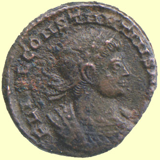 This coin is another Siscia mint issue and lists in LRBC as number 749. The coin is heavily corroded and struck off center, making the last four letters of the obverse legend hard to read.