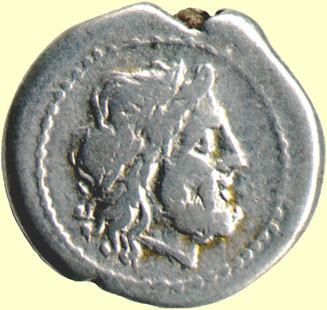 This Roman silver coin was struck about 205 B.C. The obverse bears an image of the head of Jupiter. The coin is a little bit smaller than a denarius, about the size of most contemporary Greek drachms.