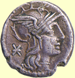 The image on the obverse is that of the helmeted head of Roma. The X with crossed center behind her head signifies that the denarius at that time was worth 10 copper asses. Later during the Imperial period, the coin was tariffed at 16 asses.