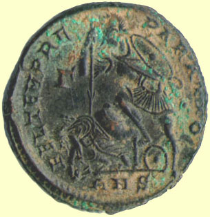 The reverses of Fourth Century coins will usually have an allegorical figure symbolizing some virtue or value such as victory, a wreath, an altar, or an emperor in military dress dragging a captive or spearing a foe. Many variants of these basic reverse types exist. It is not rare for a collector to find that he or she has purchased an odd or rare variant of these types for only a few dollars out of an ancient coin dealer's junkbox. In fact, if you explore this site, you will see several pieces that are not found in any catalogue. This does not necessarily mean that the coin is a fake. There were so many different ways the ancient artist could have engraved a shield, armor, clothing, a figure of Victory, or the lettering in the inscriptions that thousands of interesting little varieties exist. Even the very thorough, painstaking research of the British Museum scholars and other numismatists working over the last one hundred fifty or more years has not brought all of them to the light of day. You may get lucky and find a real gem early in your collecting. The list below contains some of the more common varieties with which we'll start: