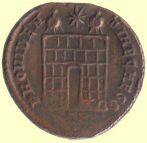 This type of AE4 with camp gate reverse was struck during the reigns of Constantine I and his sons Crispus, Constantine II, Constans, and Constantius II.