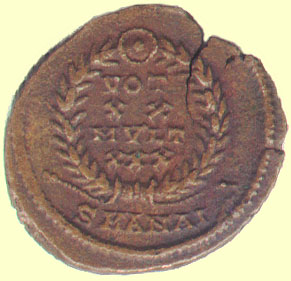 This legend is usually something like VOT V MVLT X or VOT X MVLT XX. The wreath types are very common and, like the altar with inscription types, were issued on the occasion of the emperor paying his vows every fifth anniversary of the beginning of his reign. The vows were a money sacrifice paid to the gods (later the Catholic Church) in thanks for the last five years and to ensure that the emperor would have a good reign during the next five years.