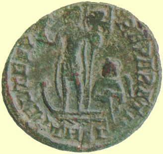Bronze AE2 of Constans with Emperor Standing on Ship Steered by Victory Reverse