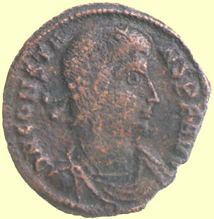 Bronze AE2 of Constans with Emperor Standing on Ship Steered by Victory Reverse