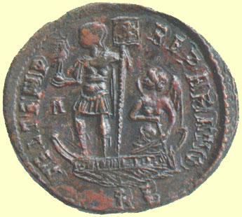 Bronze AE2 of Constans with Emperor Standing on Ship Steered by Victory Reverse