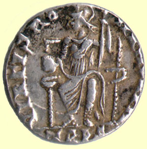 The seated figure illustrated on the coin at right is Roma, a personnification of the City of Rome. The legend reads Virtus Romanorum, or "The Valor of the Romans" The coin is a siliqua of Magnus Maximus, Master General of Valentinian II who murdered his emperor and seized the throne instead. Maximus' big mistake was murdering Valentinian. He probably would not have incurred the wrath of Theodosius and could have gone on to rule the West in deed if not in name had he not murdered the powerful Eastern emperor's brother - in - law.