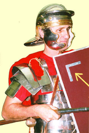 On this page and the previous two pages, Robert Garbisch portrays a Roman infantryman of the First Century A. D. The body armour, or segmented lorica, is patterned after Roman armour discovered at Newstead, in Scotland, and the Roman town of Corstopitum, near Corbridge, in England. His helmet is a copy of one found near Mainz, in Gaul. The gladius, or short sword, is an exact replica of one found in the ruins of Pompeii. Robert has recently "revived" LEGIO X FRETENSIS, the Roman Tenth legion that was stationed in Judaea during the time of Jesus Christ and the Roman emperors Augustus and Tiberius. This reenactment group is devoted to researching and accurately portraying the lives of typical Roman soldiers during this period. |