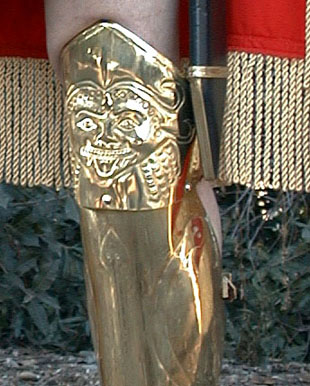 This closeup image shows the fine workmanship that went into making the hand crafted greaves that Steve is wearing. They are authentically Roman in style, accurately reflecting the Romans' tastes in the use of fantastic stylized faces of mythical animals and beasts in the adornment of their military accoutrements and weapons. These might include a bull with the head of a man, a centaur, which is a horse with the upper body of a man, a griffin, which was a winged lion, a likeness of Medusa's head with writhing snakes instead of hair, or any number of creatures which were a combination of humans and beasts. |