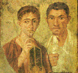 The Romans were very fond of writing and valued an education very highly. Therefore, they found many ways to get around the expense and bulkiness of papyrus and parchment scrolls. For personal use and for short notes that would be erased later, they used small wax tablets. These were usually bound together on a leather thong or arranged to fold together like modern book covers or like an accordion. The individual tablets were made of wood and had a raised edge, forming a shallow box. Into this box, molten wax was poured and allowed to cool with a smooth surface. This wax was usually a deep red or reddish brown in color. A metal or bone STILVS (stylus) was used to write upon the tablet, the pointed end to make the letters and the flattened end to smooth over and "erase" writing that was no longer wanted. These folding tablets and styli were the standard writing materials for Roman schoolchildren. They went by many names. In Latin they were called cerae or codices. In the Greek portion of the empire, they were called diptycha, trypticha, and other names which began with the Greek word for the number of individual tablets in the set. The Romans loved to have their portrait painted or a mosaic portrait made of themselves holding a rolled book or a wax tablet and stylus, like the image at top right. They felt that these articles symbolized the education and cultured background of those who were shown holding them. Color photographs of writing stylii, inkwells, and other implements may be seen in the excellent Eyewitness Books title Ancient Rome, which will probably be available from larger booksellers and public libraries for the next few years.