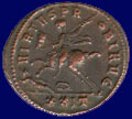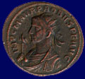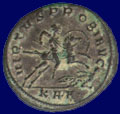 VIRTVS PROBI AVG, XXIT in exergue. Probus on horseback left with shield and spear riding down captive.